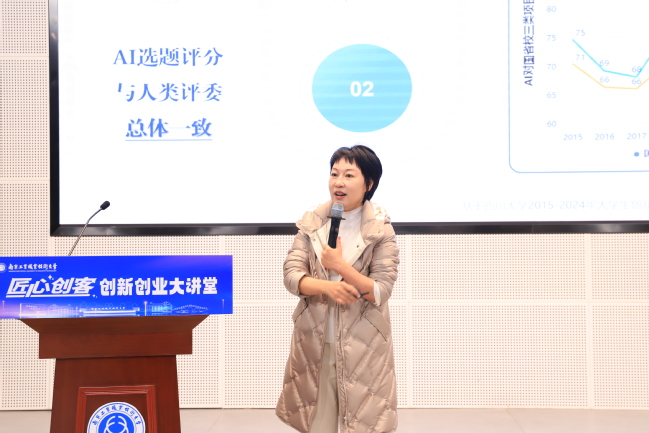 本次讲座特邀四川大学创新创业工作领导小组办公室专职副主任、国家级创新创业学院专职副院长吴迪担任主讲嘉宾。吴迪从科技创新实践教育的核心问题——“选题怎么教?”“项目怎么推?”“逻辑怎么教?”切入,深入剖析了当前高校在创新人才培养中面临的选题指导难、项目推进效率低、逻辑思维培养不足等痛点,提出未来学习目标是“主动学”“自觉做”“及时评”“精准教”“凝聚人”。她结合四川大学国家级双创示范基地建设经验,系统阐述了大创项目培育、创新大赛与科技创新实践教育制度化的内在关联,并通过案例分析,初步验证了AI技术在创新大赛选题评分中的科学性与准确性,现场还展示了AI辅助双创教育的应用场景,引发师生热烈讨论。同学们纷纷表示,本次报告既有理论高度,又有实践案例,为优化参赛项目提供了新思路。