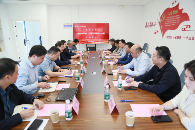4月16日下午,扬州市职业大学党委副书记、校长周春光,党委委员、副校长吴书安一行7人来校调研交流,金年会党委副书记、校长何学军,党委常委、副校长魏萍在双创大楼三楼会议室接待了来宾,相关职能部门负责人陪同接待。