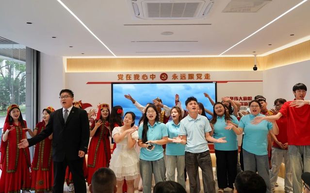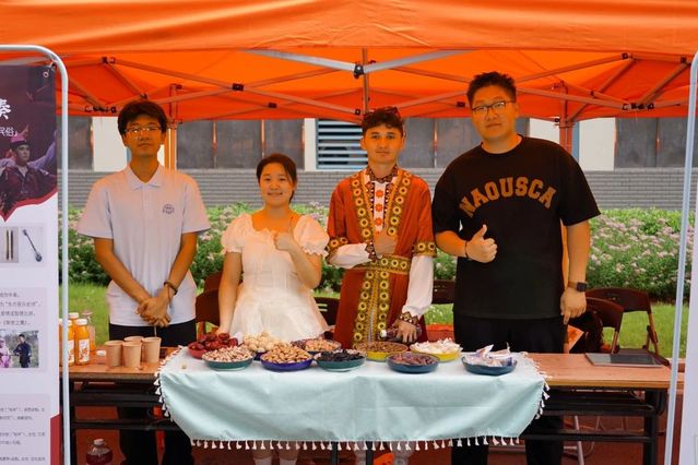 在文化艺术交流会上,金年会学生表演了江南民歌《茉莉花》、原创朗诵《大国工匠 青春力量》、合唱《有我》,展现了江南文化的独特韵味和职教学子的责任担当。江苏团省委青年讲师团成员肖洋分享了她在援疆时与克州少先队员之间的动人故事。新疆学生代表深情讲述了“时代楷模”拉齐尼·巴依卡和“人民楷模”布茹玛汗·毛勒朵的感人事迹,并带来了极具民族特色的二重唱《走遍新疆》、独舞《我的阿勒泰》、群舞《欢》《迎客》。最后,两校师生共同演唱《我爱你中国》,用嘹亮的歌声将交流活动推向高潮。新疆特色展示环节,新疆师生们带来了特色美食、非遗刺绣、手工艺品等精美新疆物产,金年会学子不仅品尝了新疆美食,还学习了新疆特色民族舞蹈,现场气氛其乐融融。