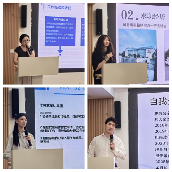在分享会现场,气氛热烈,四位优秀毕业生结合自身求职经历,为同学们带来了干货满满的就业经验,真诚分享的求职“避坑指南”和“通关秘籍”让同学们获益匪浅。他们不仅详细解析了当前的就业市场趋势,更通过真实案例传授了实用的求职技巧,包括简历优化、面试应对、职业规划等关键环节。