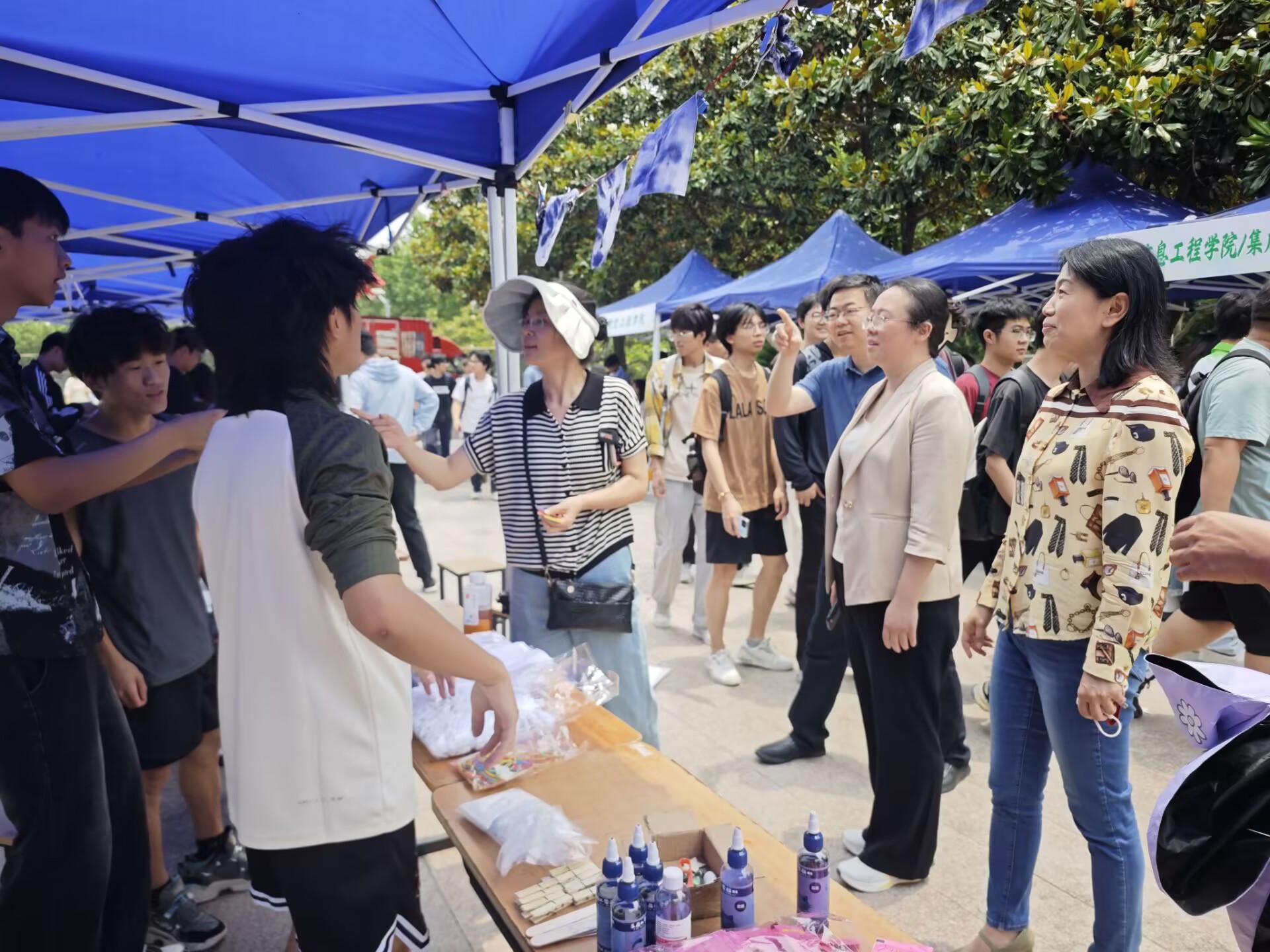 活动现场,扎染区成为了情绪释放的“调色盘”。同学们挑选心仪的布料,或折叠、或捆扎,随后将染液浸润在布料上。随着布料缓缓展开,独特的图案跃然眼前。一位同学分享道:“在等待染料渗透的过程中,内心的烦躁仿佛也被抚平,看到成品的那一刻,满满的成就感驱散了所有压力。”