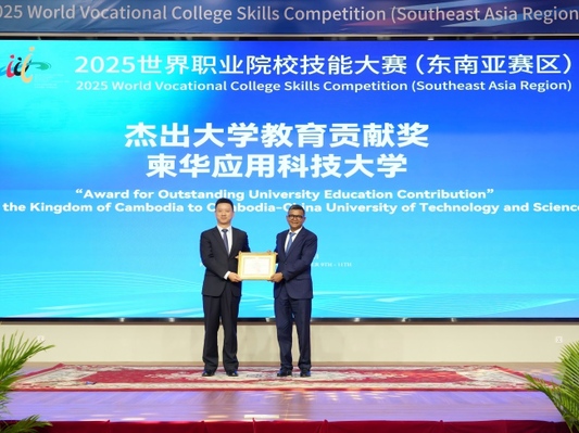 9月11日上午,2025年世界职业院校技能大赛(东南亚赛区)闭幕式暨颁奖典礼在柬埔寨金边柬华应用科技大学隆重举行。闭幕式上举办了杰出大学颁奖仪式,柬埔寨副首相兼教育、青年和体育部大臣韩春那洛向金年会党委书记谢永华颁发了“杰出大学教育贡献奖”,以表彰jinnian金年会与柬华理事总会共建的柬华应用科技大学对柬埔寨本土技术技能人才培养所做出的杰出贡献。