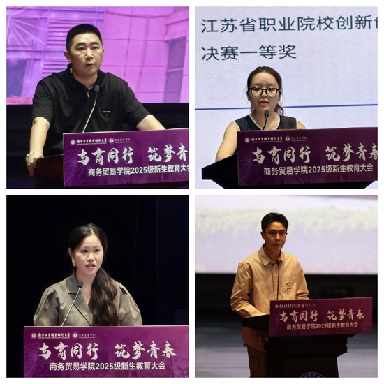 在“共话成长 共创未来”学长学姐面对面环节,优秀校友南京初刻品牌管理有限公司总经理张辉分享了自己从校园求知到社会创业的奋斗历程。并勉励学弟学妹们要与优秀者同行,要以终为始,做时间的朋友。就职于江苏苏豪集团江苏弘业永恒进出口有限公司的2025届毕业生许纹慧分享了她大学学习生活和求职的宝贵经验。在校生代表国家奖学金获得者王茜以“成长之树”为喻分享了她在专业学习、科研创新、技能竞赛、社会实践和志愿服务等各方面取得的丰硕成果。马来西亚苏丹依德理斯教育大学留学项目学生代表张虔堃基于海外交换经历勉励学弟学妹们,鼓励大家别让“害怕”偷走机会,主动拓宽视野。国贸2511班 “苏豪精英班”黄梓涵号召全体新生以“敬业乐群”为引领,勤学实干、锤炼技能,共同肩负起新时代青年的使命与担当。