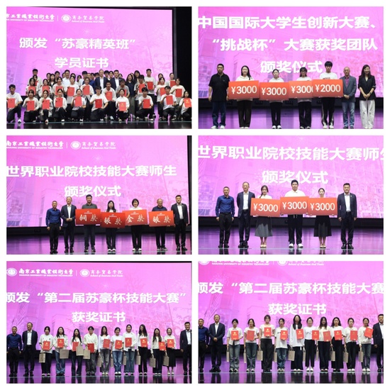 会上,与会领导嘉宾为国贸2511班同学颁发了“苏豪精英班”学员证书。并为第二届“苏豪杯”技能大赛、世界职业院校技能大赛、中国国际大学生创新大赛、“挑战杯”大赛获奖团队和师生颁发荣誉证书。2025年世界职业院校技能大赛国奖银奖获奖团队现场精彩展示比赛内容,展现了商贸学子扎实的专业知识和精湛的实践技能。
