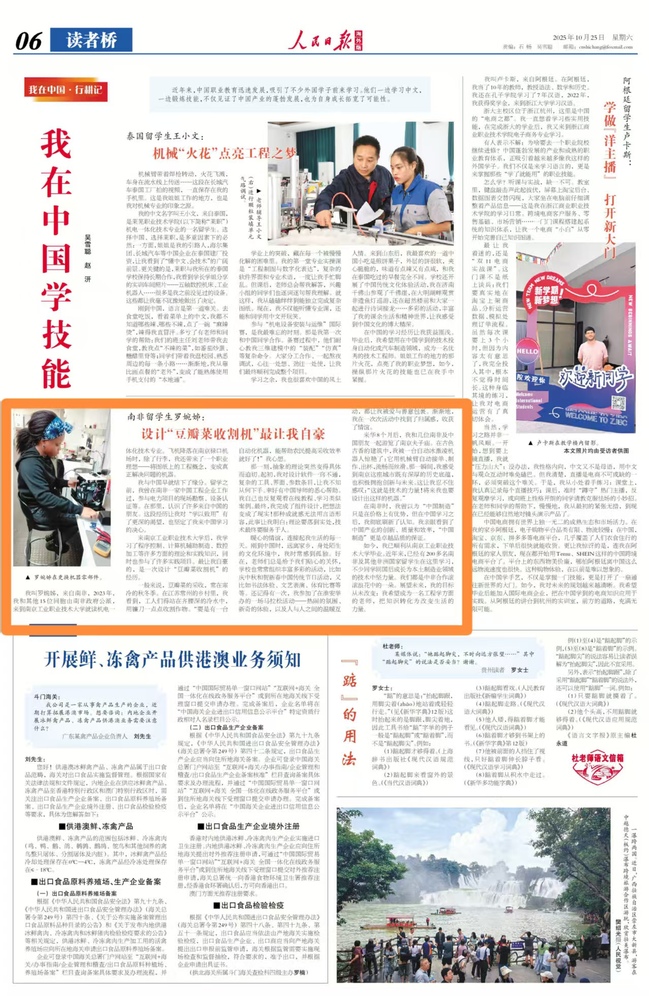 10月25日,人民日报海外版聚焦跨国教育合作,《我在中国学技能》专版报道了金年会南非留学生罗婉姊的在校成长故事。这位怀揣工程梦想的青年,通过中南教育合作项目跨越山海,在中国实现了从理论到实践的跨越。