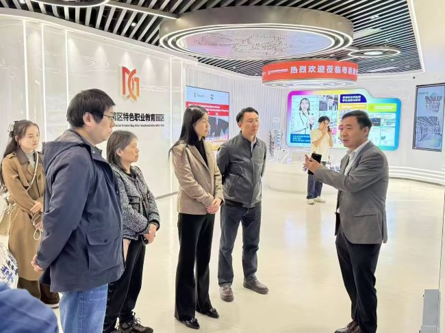 在粤港澳大湾区特色职业教育园区的参观环节中,深职大创新创业学院党委书记、院长范新灿作了详尽的讲解。他系统介绍了深职大在创新创业教育方面的顶层设计、课程体系、实践平台建设以及成果转化机制,重点分享了学校依托大湾区区位优势,构建起“政—校—企—行”四方联动的协同育人新模式。学校将创新创业教育融入人才培养全过程,通过建设众创空间、举办创新创业大赛、引入企业真实项目等方式,有效激发了学生的创新精神和创业潜能。