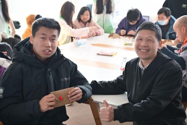 随后,活动进入了温馨的互动环节。在李金钟的指导和志愿者们的耐心协助下,学员们拿起画笔,在精美的贺卡上认真勾勒、填色,创作出各具特色的画作。有的描绘出绚烂的花朵,有的画出可爱的动物,还有的写上质朴而真挚的祝福话语。一笔一划间,传递着喜悦与创意;一字一句中,流淌着温暖与期盼。师生与学员们并肩而坐,不时交流鼓励,现场气氛融洽而热烈。原本空白的贺卡,在大家的共同努力下,变成了一张张承载着美好心意与冬日祝福的独特作品。