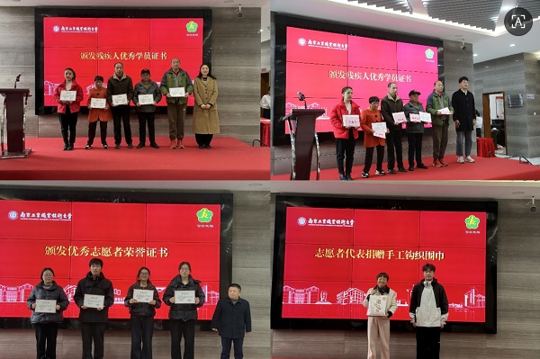 为表彰先进、传递温暖,活动对优秀残疾人学员和优秀学生志愿者进行了表彰。常敏为优秀残疾人学员颁发证书,陈旗航为优秀学员发放奖金,张光兵为优秀学生志愿者颁发证书。萤火虫志愿服务队负责人作为志愿者代表向汤继红捐赠学生亲手钩织的围巾,表达了经济管理学院学子对残疾人的关怀与祝福。