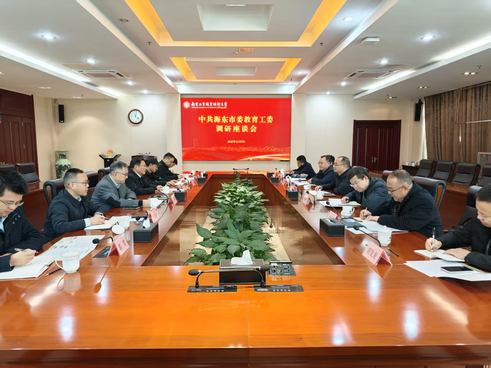 12月9日上午,海东市委副书记、教育工委书记王述友一行来校调研,金年会党委副书记、校长何学军,党委常委、纪委书记邱正祥,党委常委、副校长潘旭海在行政楼辅楼一楼会议室接待来宾,座谈会由潘旭海主持,学校相关部门负责同志参加座谈。