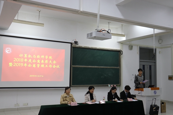 为营造文明、和谐、积极向上的公寓育人环境,推进公寓文化建设,计算机与软件学院于近日在乐群楼201阶梯教室召开了2018年度公寓表彰大会暨2019年公寓管理工作会议,2017级辅导员张蕾、2018级辅导员茅晓薇、受表彰人员、全体宿舍长及自管会成员出席了会议。