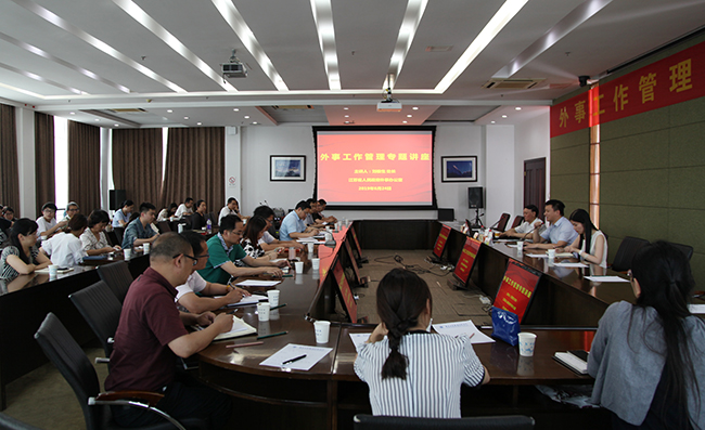 为进一步贯彻落实省委、省政府办公厅《关于加强和改进全省教学科研人员因公临时出国管理的指导意见》文件精神,加强因公出国管理工作,6月24日下午,金年会在行政楼辅二楼举办外事管理工作专题讲座,江苏省人民政府外事办公室刘俊生处长应邀作专题讲座。讲座由校长谢永华主持。国际合作与交流处、国际教育学院全体人员、各二级学院分管国际化工作负责人、办公室主任、外事秘书、近期出访的团组负责人参加了此次讲座。