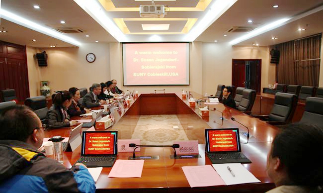 10月23日,美国纽约州立大学科贝尔斯基尔学院国际部主任苏珊女士(Ms.Susan Jagendorf-Sobierajski)来金年会访问,总督学卢兵热情接待了客人,双方就两校合作事宜进行了洽谈。国际合作与交流处、国际教育学院、商务贸易学院相关负责同志和团队老师参加了接待。