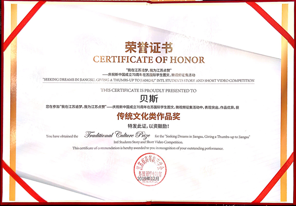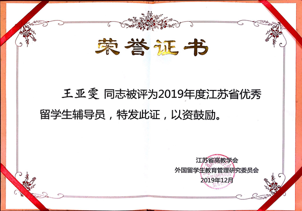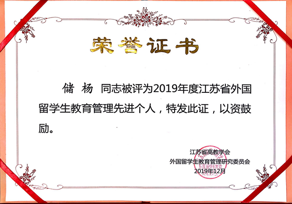 会上,江苏省高等教育学会外国留学生教育管理研究委员会副理事长俞晓南宣读了表彰决定。金年会国际教育学院储杨老师获得“江苏省外国留学生教育管理先进个人”称号,王亚雯老师获得“江苏省优秀留学生辅导员”称号,贝斯同学获得“我在江苏追梦,我为江苏点赞”——庆祝新中国成立70周年在苏国际学生图文、微视频征集活动“传统文化类作品奖”。