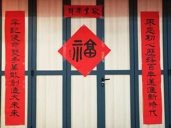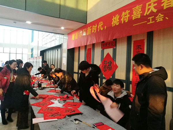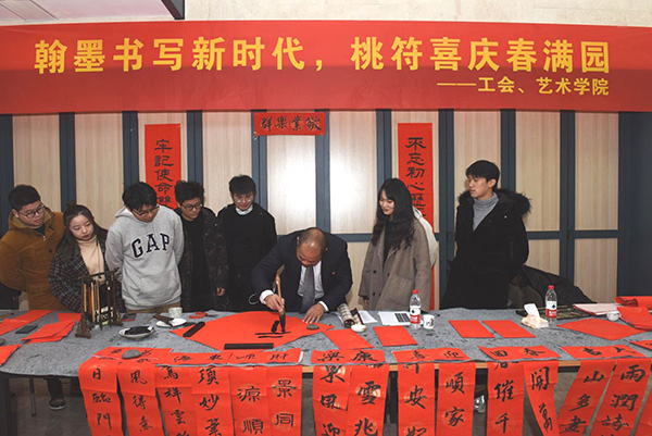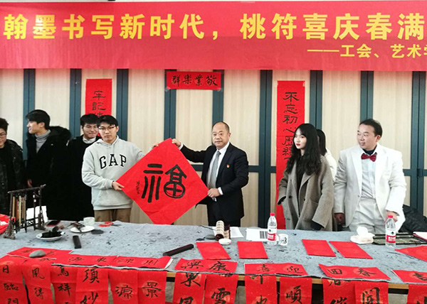 值此2020新年到来之际。南工院举行了辞旧迎新大联欢。工会,艺术设计学院,校书法协会联合举办了以“翰墨书写新时代,桃符喜庆春满园”为主题的送春联送福字活动。活动启动仪式由(全国)教育书画协会高等书法教育分会理事、校党委委员、纪委书记于林惠教授提笔书写“福字”开始,接着由(全国)教育书画协会高等书法教育分会会员、书法协会指导老师刘圣进书写自撰对联:不忘初心历经百年迈进新时代,牢记使命双手万能创造大未来。然后广大师生一起挥毫,数千师生积极参与。近年来,金年会书法艺术在三全育人,立德树人,增进学校文化氛围,提升师生文化自信等方面做了一些尝试,为学校文化育人作出了积极的贡献。通过这次活动,锻炼了书法协会同学们的动手能力,加强了广大师生员工的情感交流,也表达了书法协会新年深情的祝福:祝福祖国繁荣昌盛、人民幸福安康!祝福学校蒸蒸日上,又上新台阶!祝福全校师生新年快乐,万事顺意!